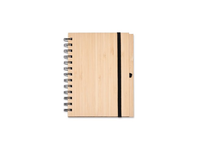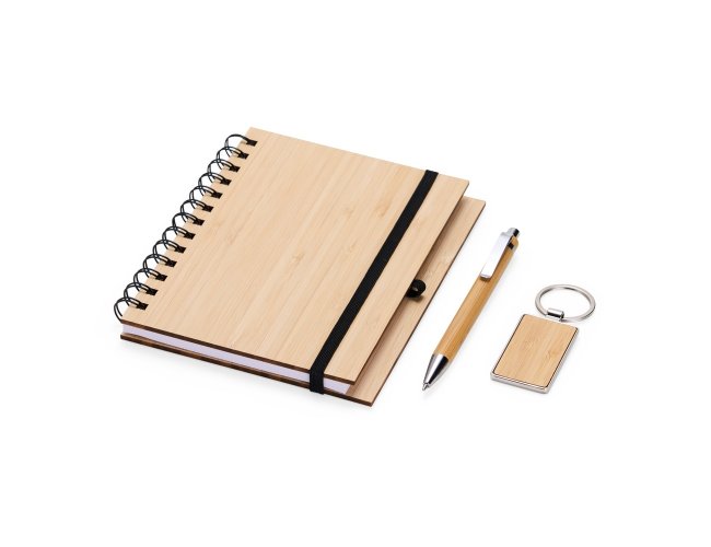 Kit composto por 3 peças: sendo uma caderneta de bambu com capa dura, contendo aproximadamente 70 folhas brancas pautadas, uma caneta de bambu com clipe metálico e um chaveiro de bambu com detalhe em metal. Item perfeito para quem busca elegância, sustentabilidade e o toque natural que só o bambu proporciona.