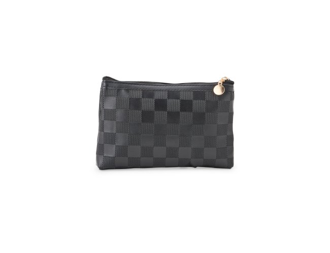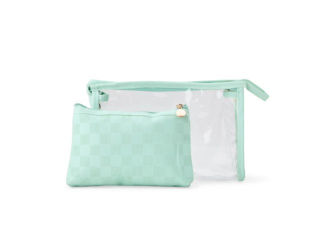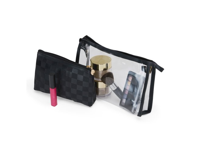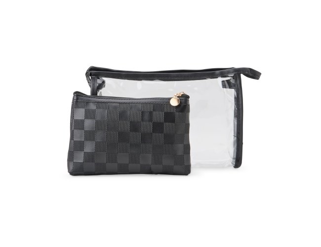 Conjunto de dois nécessaires em tamanhos diferentes. O modelo maior é confeccionado em PVC impermeável, traz detalhes em couro sintético, alça lateral prática e fechamento em zíper. Já o menor, produzido em PU impermeável, possui acabamento quadriculado e fechamento em zíper.