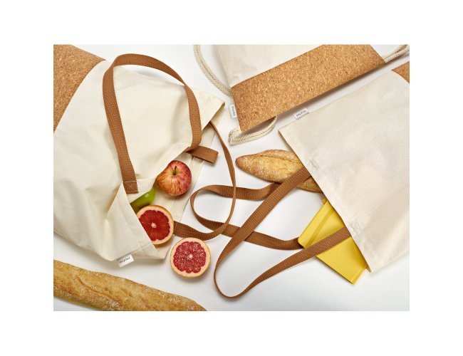 Sacola em 70% algodão reciclado e 30% poliéster reciclado (220 g/m²) com fundo em cortiça. Alças em webbing com 65 cm. 460 x 380 x 100 mm