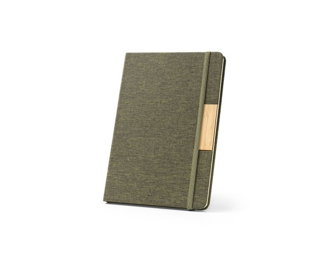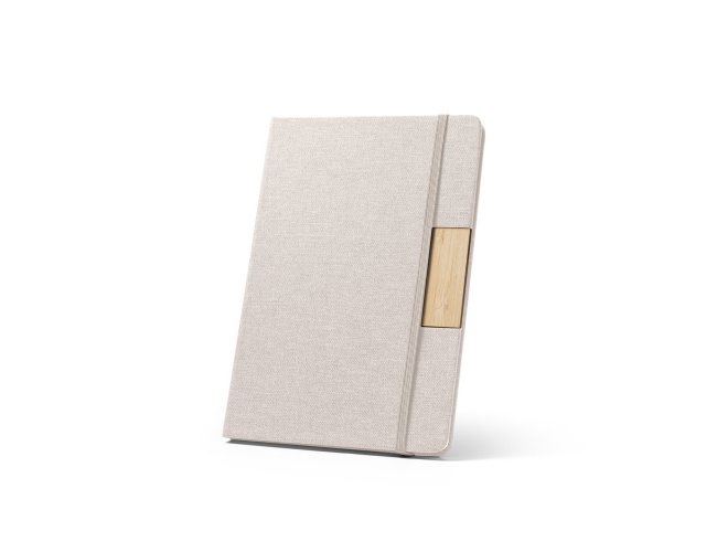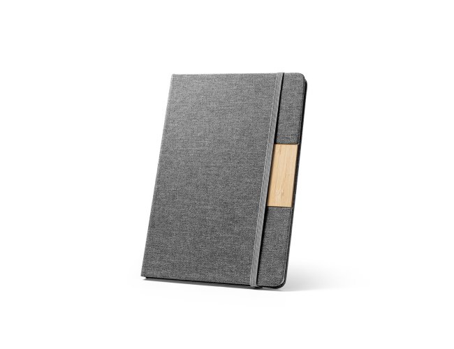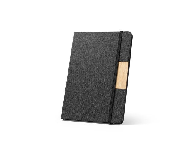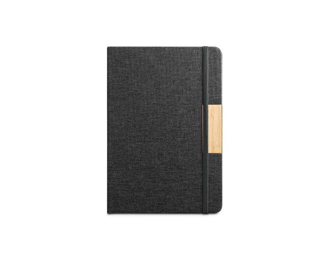 Caderno A5 de capa dura em tecido poliéster 100% reciclado (100% rPET) e detalhe em bambu. O interior contém 80 folhas pautadas em papel cor marfim reciclado, fita separadora e elástico para fecho do caderno. A cor e o resultado da impressão nos materiais naturais pode variar entre produtos. 146 x 210 mm