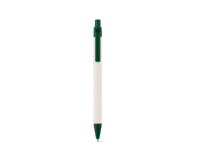 Esferográfica produzida através de pacotes de leite reciclados, contribuindo para o reaproveitamento do cartão e alumínio. Corpo em cartão e componentes coloridos em ABS 100% reciclado. Escrita em azul