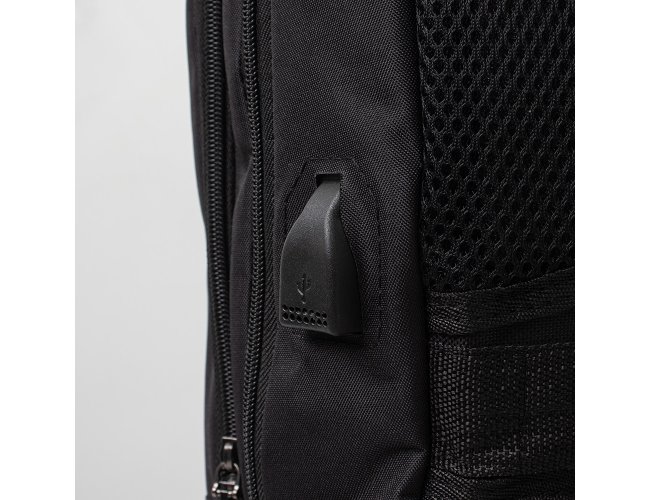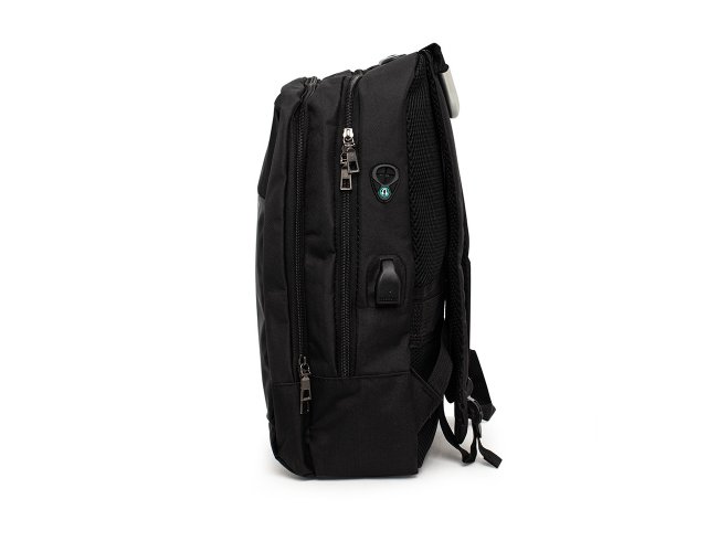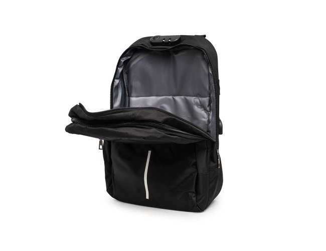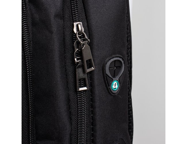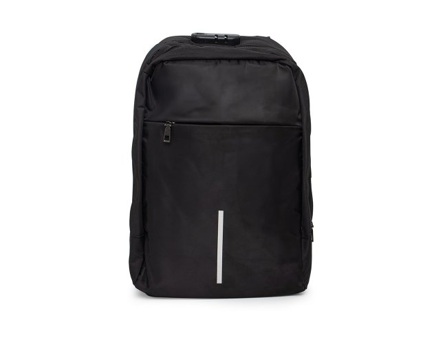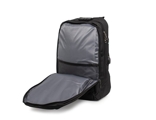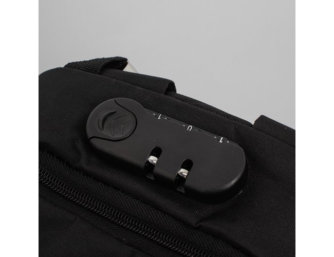 Mochila anti-furto com cadeado de segredo. Produzido em poliéster, tem a parte frontal à prova d’água (respingos). Compartimento principal com bolso para notebook 15,6 e divisórias, bolso de tela, parte externa com cadeado de segredo para trava dos zíperes; e bolso frontal. Possui entrada para fone de ouvido, suporte com entrada USB na parte externa e cabo USB acoplado internamente; permitindo a conexão de um carregador portátil na área interna e a conexão de um eletrônico na área externa, viabilizando a carga e utilização do eletrônico enquanto caminha. Alças para as costas ajustáveis revestidas com espuma, alça para mãos em alumínio e alça para encaixe em malas de viagem. Utilização do cadeado: para criar um segredo, pressione e segure o botão, crie a numeração desejada e em seguida solte o botão para assumir a codificação criada. Repita o mesmo processo sempre que necessitar fazer alguma alteração.