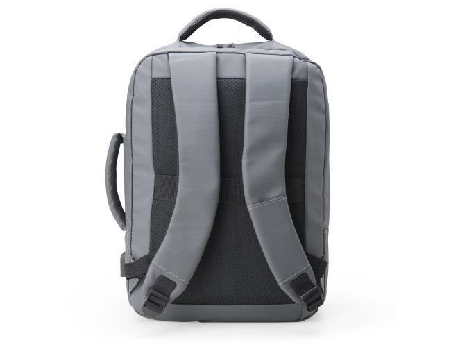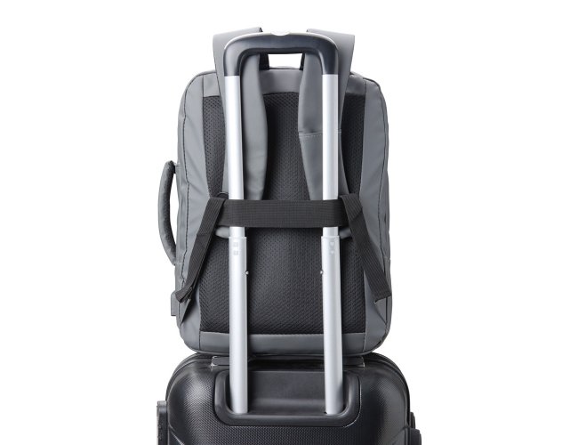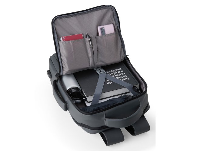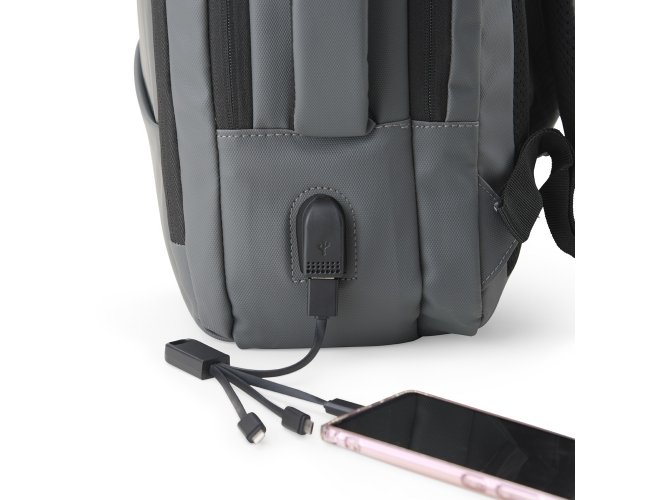 Mochila em couro sintético 23 litros resistente à água com quatro compartimentos, sendo o principal com bolso para notebook 15,6 e tablet 10. Com divisórias internas para acessórios, a mochila possui suporte externo usb, alça para encaixe em malas de viagem e duas alças de mãos, sendo uma delas lateral para o transporte da mochila no modo pasta.