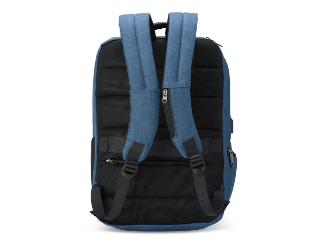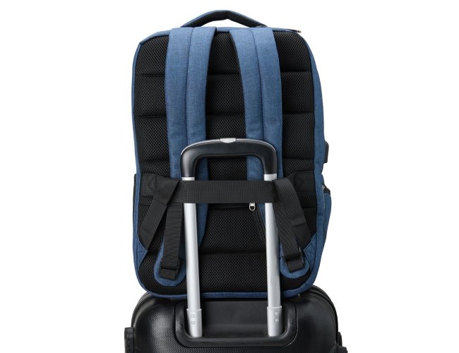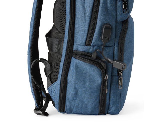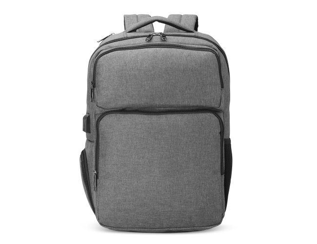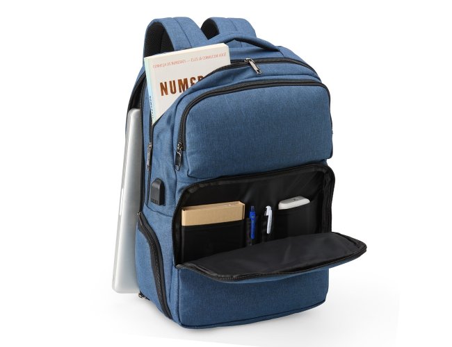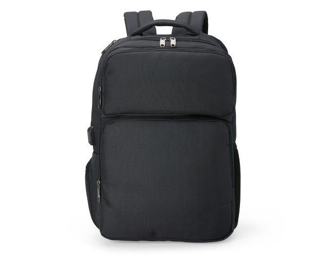 Mochila de nylon resistente à água, com capacidade de 29 litros com 6 compartimentos, sendo o principal com bolso para notebook de 15,6 polegadas e um compartimento com abertura lateral para armazenar documentos. Contém divisórias internas para acessórios e porta-chaves. A mochila possui adaptador USB externo, bolso antifurto nas costas, bolso na lateral com elástico, engate para malas de viagem, área costada com revestimento espumado e alças com bolsos integrados para cartões ou moedas.