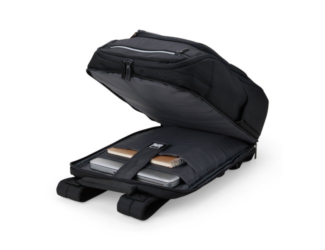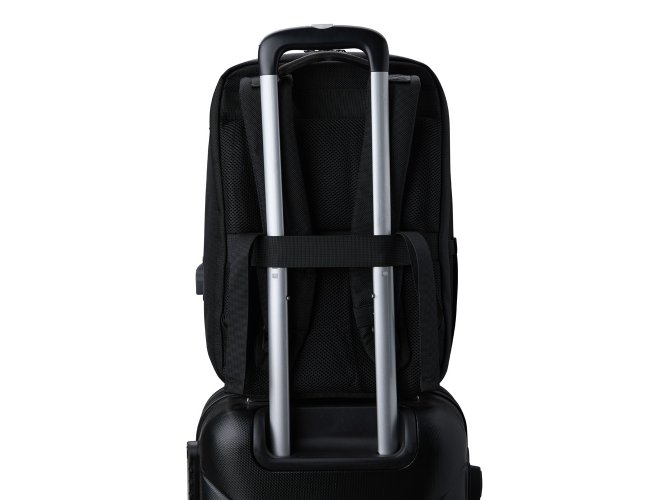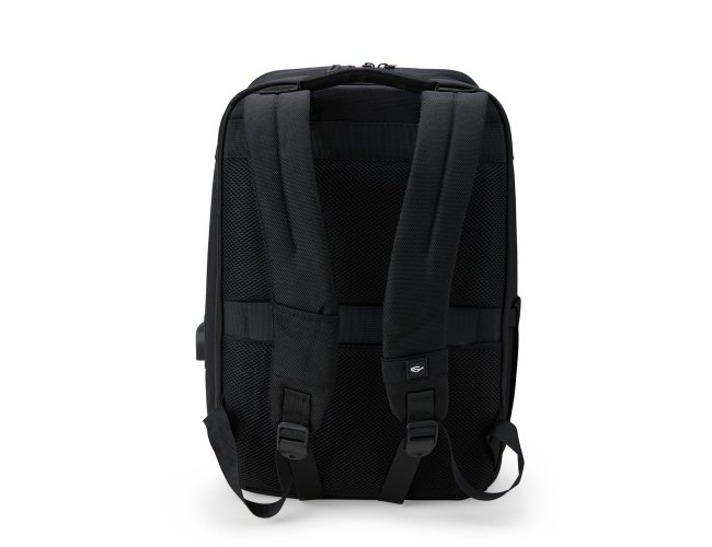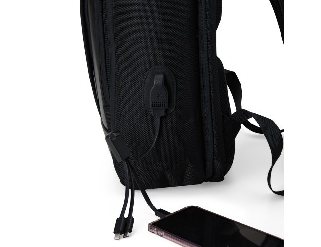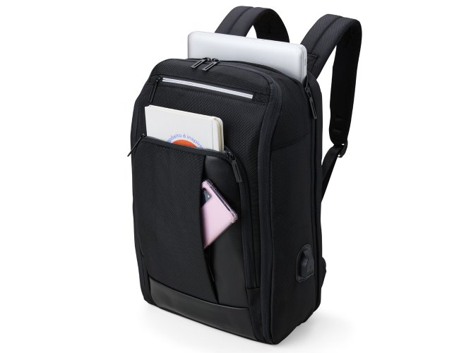 Mochila confeccionada em Nylon 23 litros com detalhes em couro sintético. Contém 5 compartimentos, sendo um bolso com faixa refletiva, divisórias internas para acessórios, bolso para tablet e notebook 15.6, bolso antifurto nas costas, bolso externo na lateral com elástico, suporte externo USB, alça para encaixe em malas de viagem, alças da mochila possuem bolsos integrados para suporte de óculos e cartões.