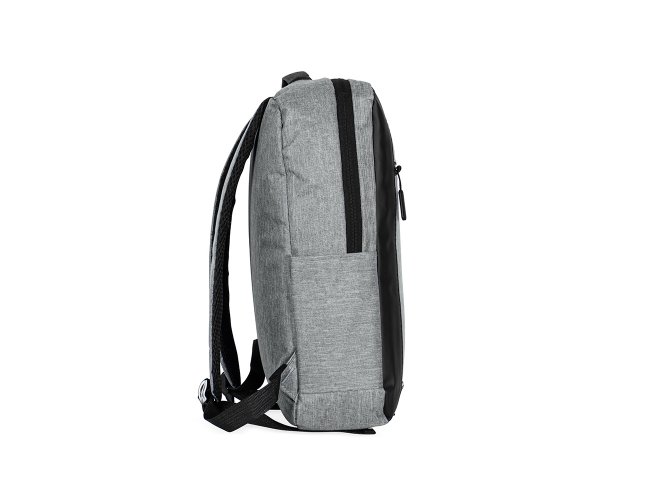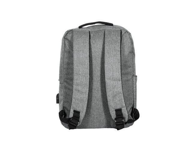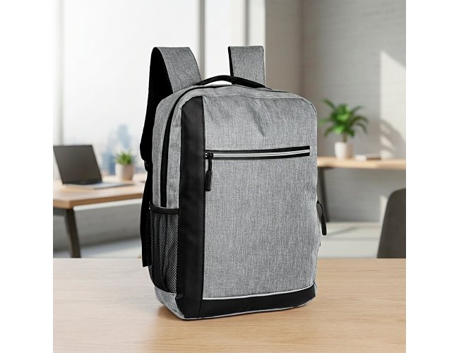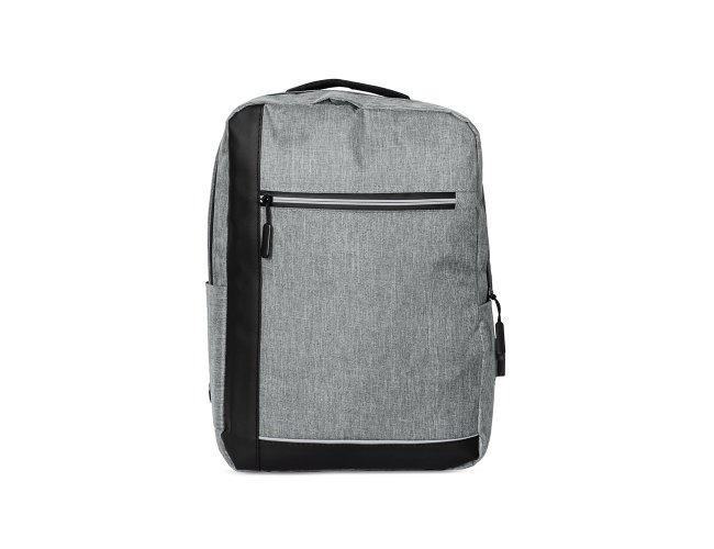Mochila confeccionada em poliéster 300D resistente à água, com detalhes em couro sintético, fechamento em zíper e capacidade para até 15 litros. Possui compartimento principal com bolsos em diferentes tamanhos e divisória para notebooks de até 15.6 polegadas. Dispõe ainda de compartimento frontal com fechamento em zíper e faixa reflexiva, além de bolso lateral aberto e adaptador USB externo.
