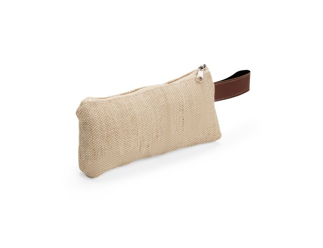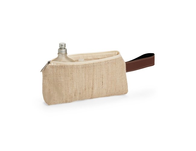 Nécessaire compacto feito em juta, alça de mão lateral em bidim e fechamento em zíper.