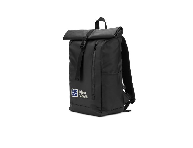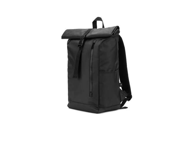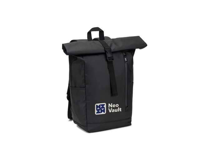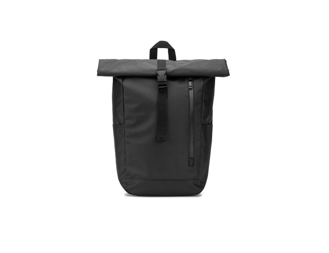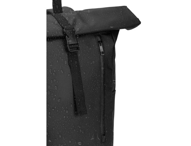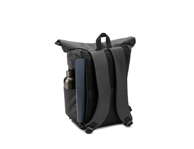 Mochila "Roll top", um design em sistema de fecho que permite enrolar a parte superior até ajustar ao volume da mochila. Composta por poliéster reciclado 600D de alta densidade com revestimento resistente à água e forro em poliéster reciclado 210D. O acabamento desta mochila confere-lhe um soft touch, tornando a sua utilização mais confortável. Possui um compartimento principal com bolso almofadado para notebook até 14", bolsos laterais e um bolso frontal com zíper impermeável. O acesso ao notebook pode ser feito pelo compartimento principal ou na parte posterior através do zíper. A parte posterior em malha incorpora uma alça trolley. Capacidade até 20 L. 270 x 440 x 150 mm