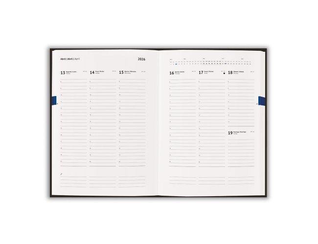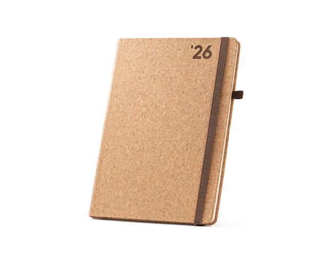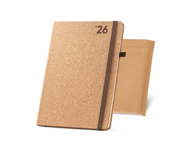 Agenda B5 em cortiça com suporte para esferográfica (não inclusa) e marcador em fita. Está organizada num plano semanal (70 g/m²). Fornecida com bolsa de non-woven. 175 x 245 mm | Bolsa: 220 x 270 mm