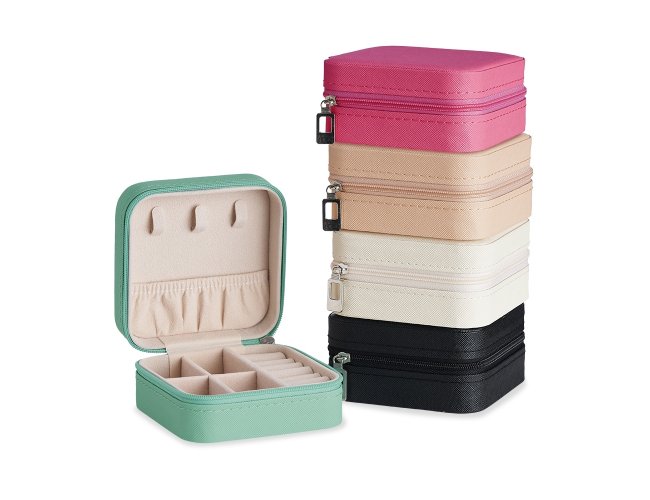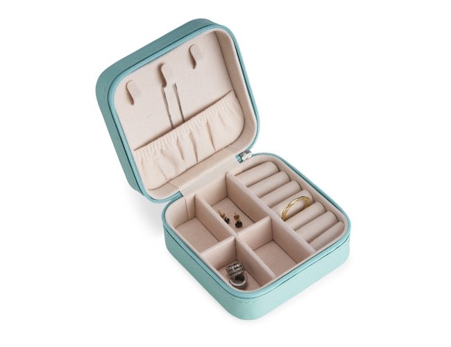 Porta-joias de couro sintético com revestimento aveludado. Possui compartimentos internos para anéis, brincos, pulseiras e colares.