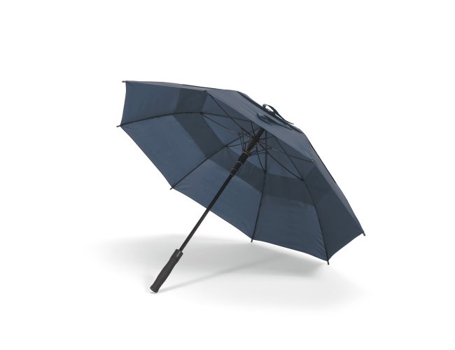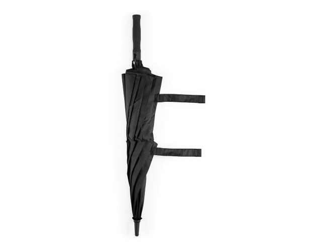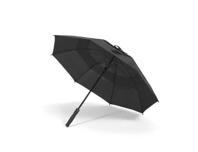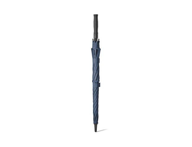 Guarda-chuva em poliéster 100% reciclado 190T, com varetas em fibra de vidro e pega em ABS reciclado. Guarda-chuva com abertura automática e à prova de vento. Fornecido em bolsa de poliéster reciclado. ø1055 x 840 mm