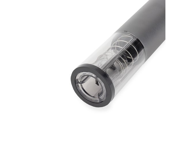 Saca-rolhas elétrico recarregável com estrutura em liga de alumínio, ABS, policarbonato e aço carbono, além de painel com iluminação em LED e botões de controle. Acompanha cabo USB-C para carregamento.