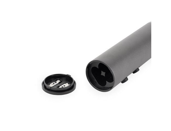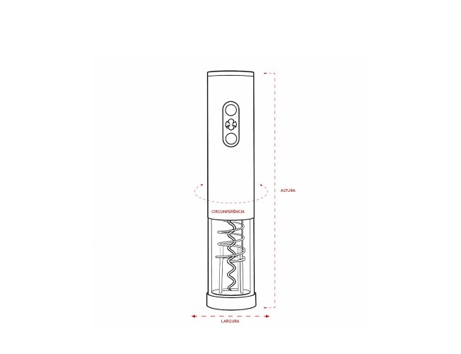 Saca-rolhas elétrico com estrutura em ABS, policarbonato, alumínio e inox, além de painel com iluminação em LED e botões emborrachados. Funciona com quatro pilhas AA (não inclusas) e acompanha cortador de lacre.