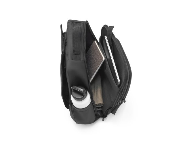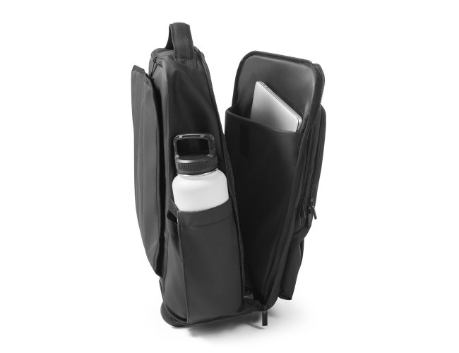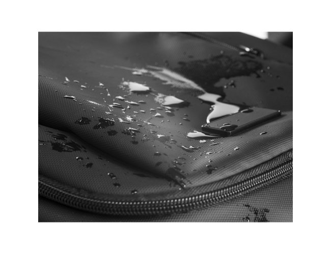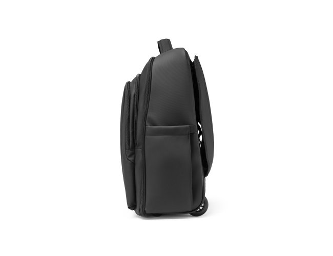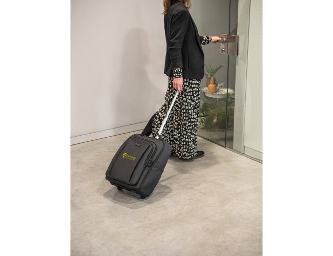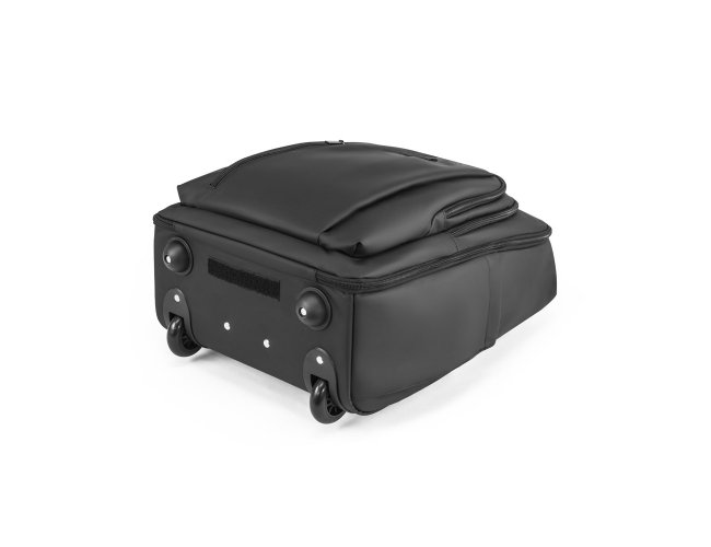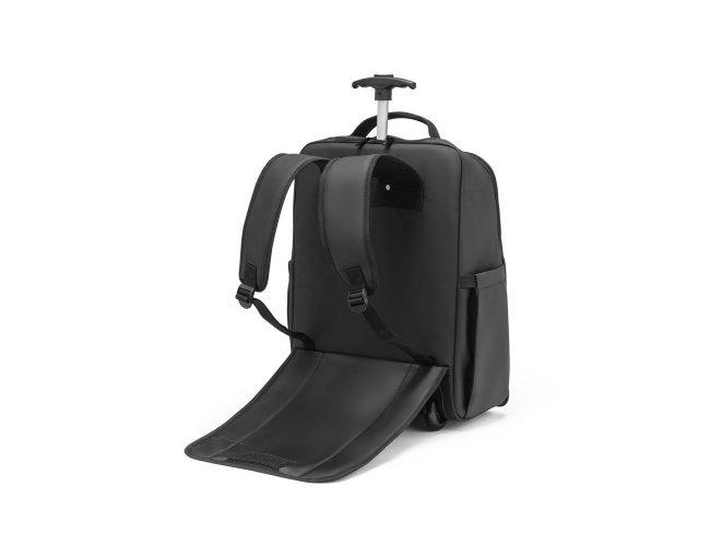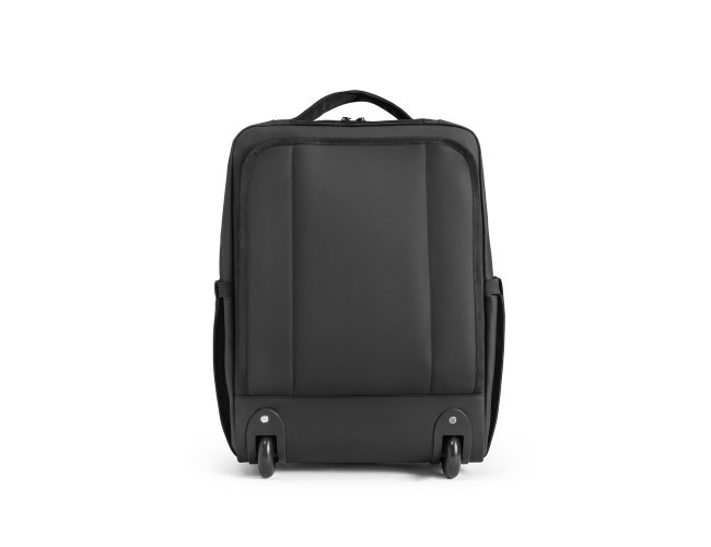 Mochila trolley em 900D com revestimento resistente à água. Compartimento principal espaçoso com bolso para portátil até 17,3", 3 bolsos frontais com zíper e 2 bolsos laterais com elástico no topo para transportar a sua squeeze. Mochila trolley com protetor de rodas e pega extensível em metal. Parte posterior e alças almofadadas. Placa metálica removível com imã, para fácil gravação. Capacidade até 28 L e peso de 1,80 kg. 330 x 480 x 185 mm