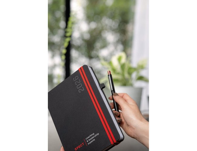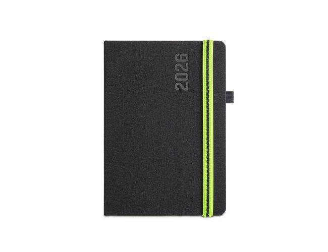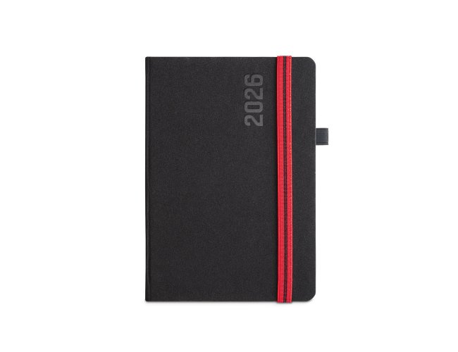 Agenda A5 em tecido poliéster. Com suporte para esferográfica (não inclusa) e marcador em fita. Está organizada num plano diário (70 g/m²). 145 x 212 mm