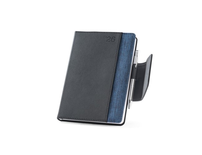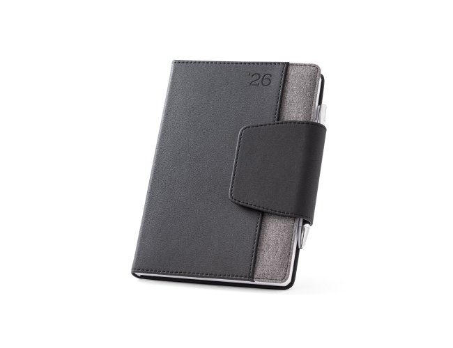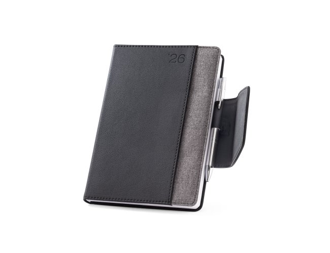Agenda A5 em PU e tecido em poliéster. Possui fecho magnético, bolso frontal, suporte para esferográfica (inclusa) e marcador em fita. Está organizada num plano diário. Fornecida com bolsa de non-woven. 148 x 210 mm | Bolsa: 205 x 250 mm