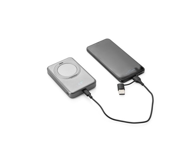 Bateria portátil magnética em ABS 100% reciclado, com carregador por indução (wireless) super-rápido. Graças à capacidade magnética e carregamento sem fios, é fácil de fixar ao seu dispositivo móvel. A argola de suporte permite adaptar a posição para colocar o dispositivo móvel na vertical ou horizontal e ajustar a inclinação. Apresenta uma capacidade de 10.000 mAh, duas portas de entrada/saída USB-C com carregamento rápido PD 20W e potência máxima de 15W para carregamento super-rápido sem fios. Compatível com dispositivos móveis com tecnologia de carregamento sem fios. Incluso um cabo de carregamento rápido de saída dupla USB-A/USB-C e um grip magnético extra para os smartphones que não têm a função magnética. Fornecida em caixa presente de papel kraft reciclado. 105 x 69 x 17 mm | Caixa: 110 x 95 x 20 mm